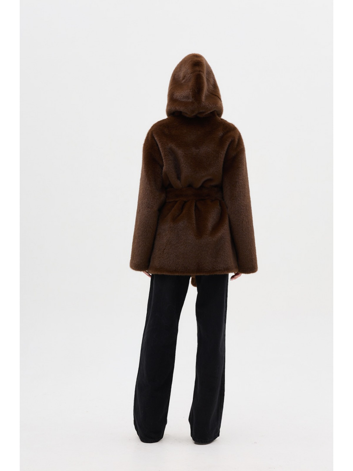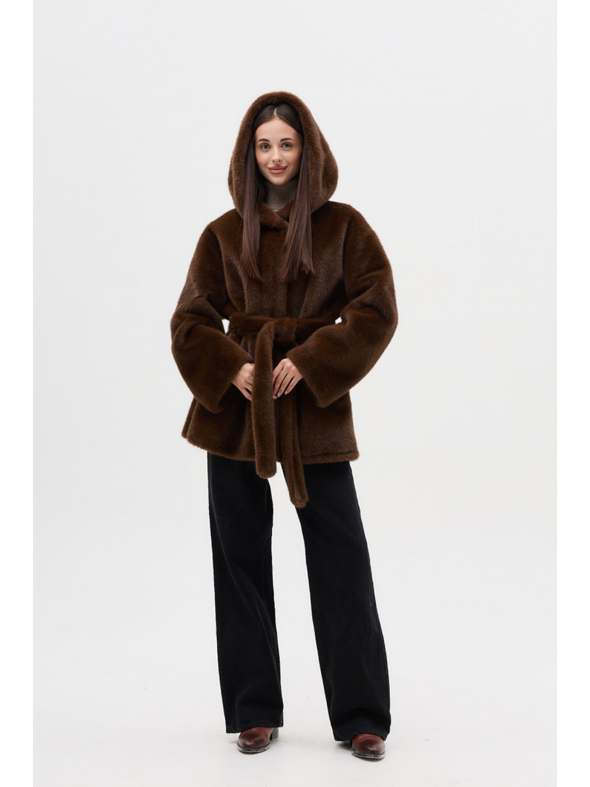 Опис: Штучна шуба з пріспущеним рукавом, з розпорками з боків, кишеня-прорізна, застібається під горло, хутро під норку на дубляже