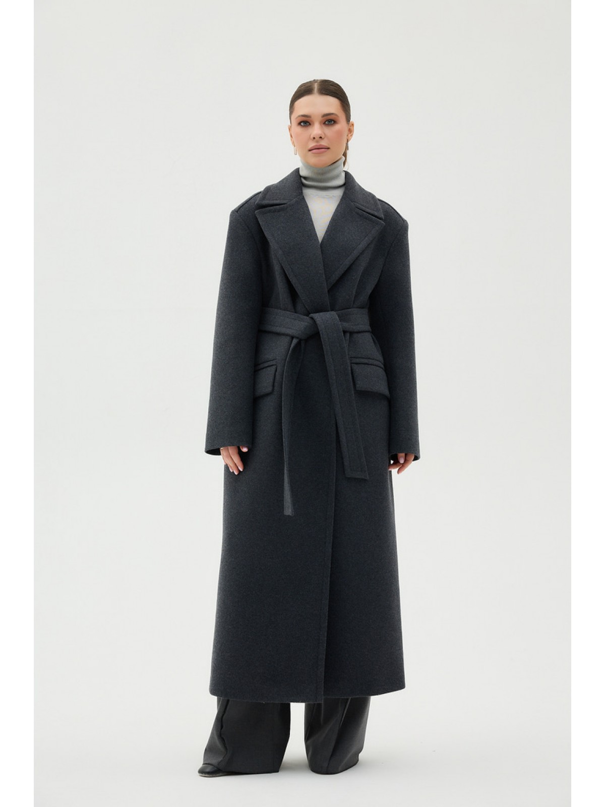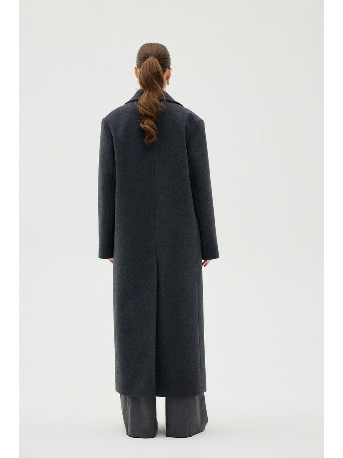 Опис: Пальто двообортне, рівного крою, об"ємне,рукав- приспущений, на рукаві декоративна складка та гудзик, англійський комір з декоративним рядком, кішені-лісточки