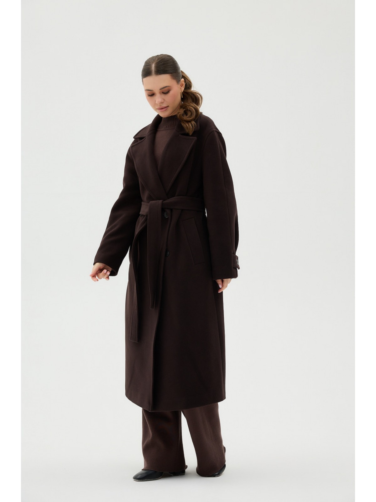 Пальто двообортне, рівного крою, об"ємне,рукав- приспущений, на рукаві декоративна складка та гудзик, англійський комір з декоративним рядком, кішені-лісточки