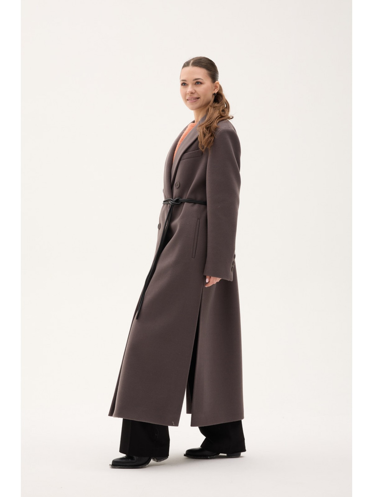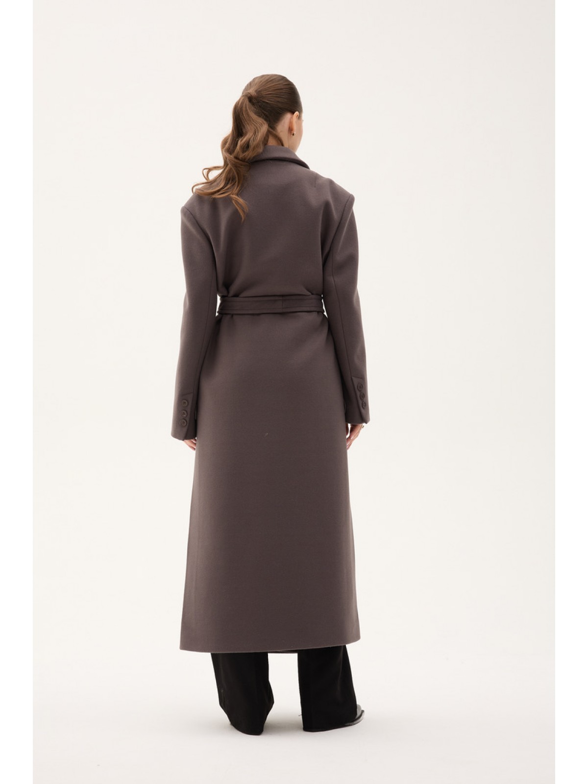 З боків передбачені високі розрізи, які забезпечують свободу рухів і легкість під час ходьби. Застібка на кнопках зберігає лаконічність дизайну, а пояс у комплекті дозволяє підкреслити талію та регулювати посадку.