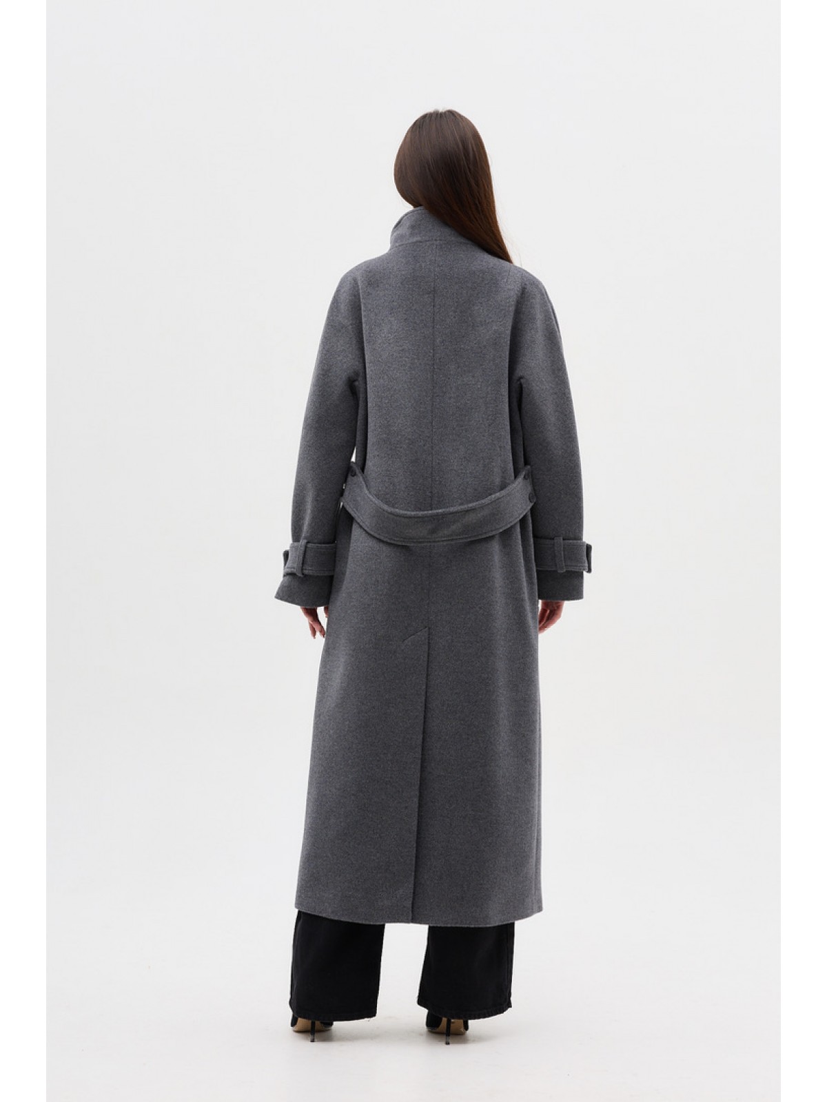 Опис: Пальто двобортне,рівного крою, з цільнокроєним рукавом, комір-стійка, кішені прорезні, на рукавах пати