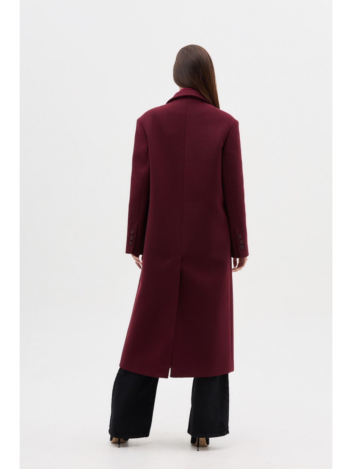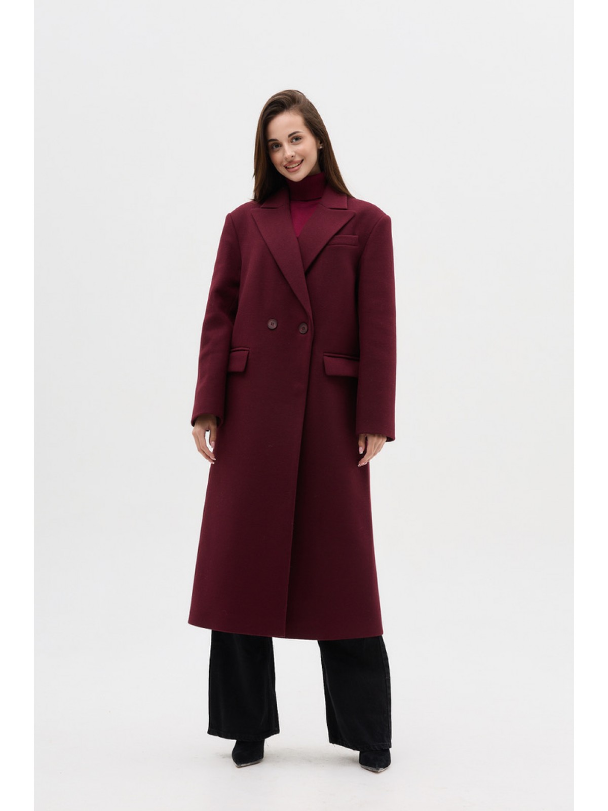 Опис: Пальто двобортне, рівного крою, з втачним акцентним плечем, комір англійський, кішені клапани