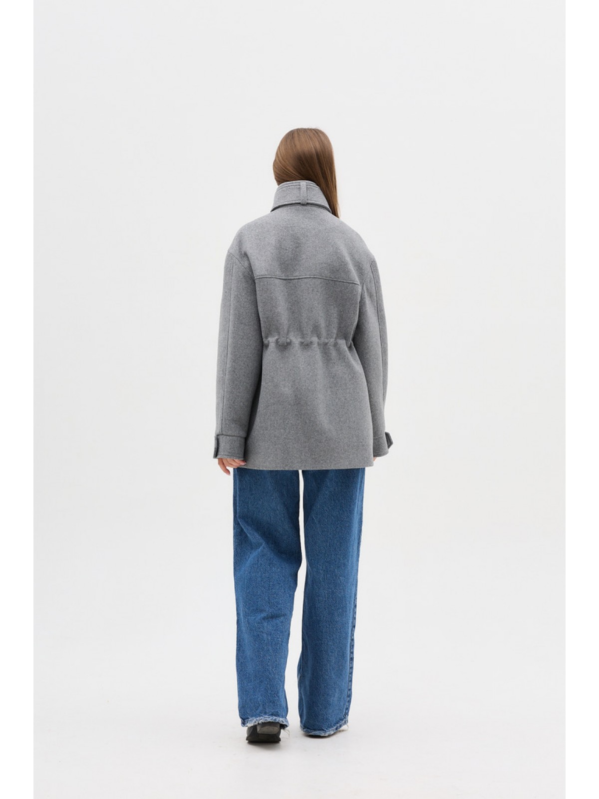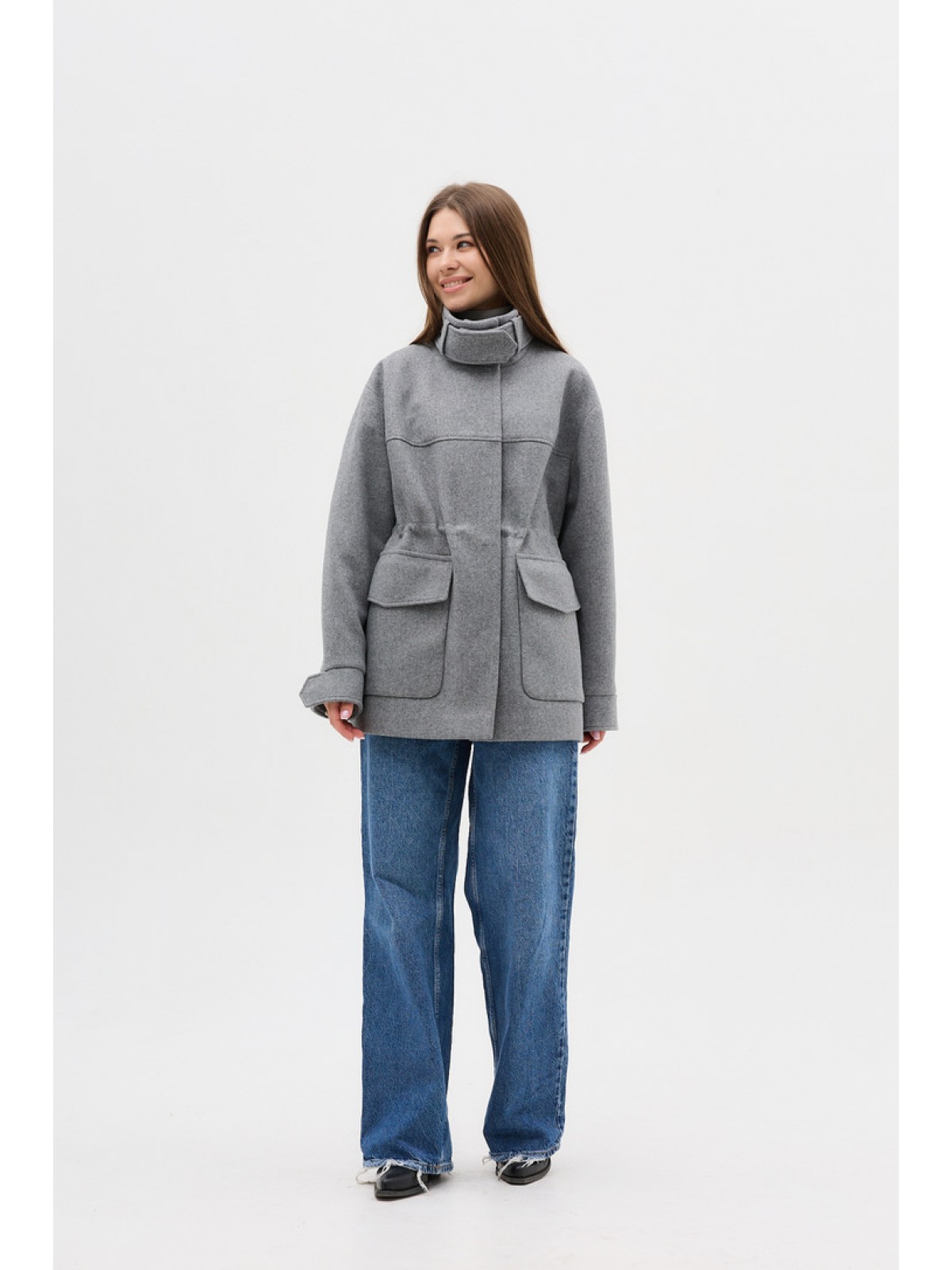 Напівпальо однобортне, рівного крою, з приспущеним плечем, комір стійка з декоративни патом, кішені акцентні, накладні, на таліі є куліса